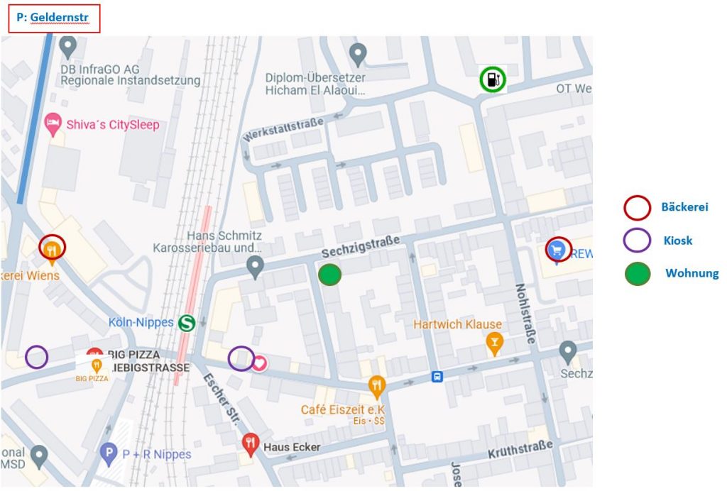 Le stationnement est gratuit toute la journée dans la Geldernstr (en haut à gauche sur la carte).