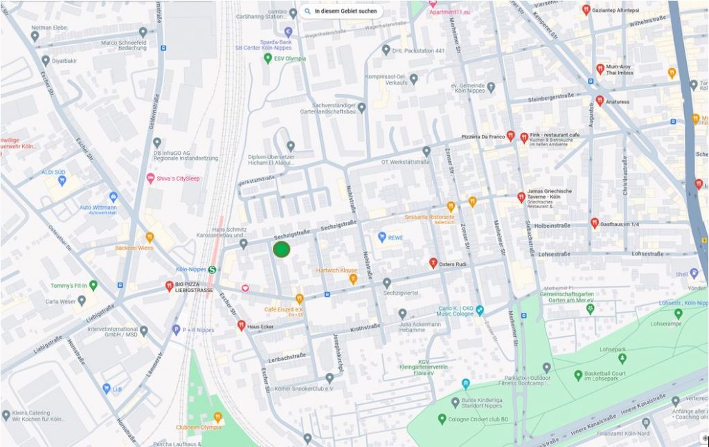 Nippes compte un grand nombre de bars, de snacks et de restaurants. Sur la carte ci-dessus, vous les trouverez sous les symboles orange. La carte ne montre toutefois que les environs directs. En direction de l’est (Neußerstr.), il y en a d’autres en grand nombre.